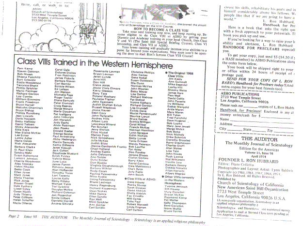 In early 1971, ASHOs The Auditor magazine, Issue 61, listed the total number of Scientologists who had trained on the Hubbard Standard Dianetics Course (HSDC). This list includes graduates from the course’s initial release in May 1969 to the publication of this magazine less than 2 years later.